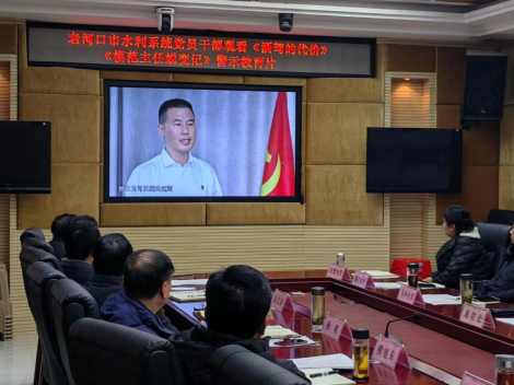 图为该市水利局‘一把手’及其班子成员观看《模范主任蜕变记》警示教育片