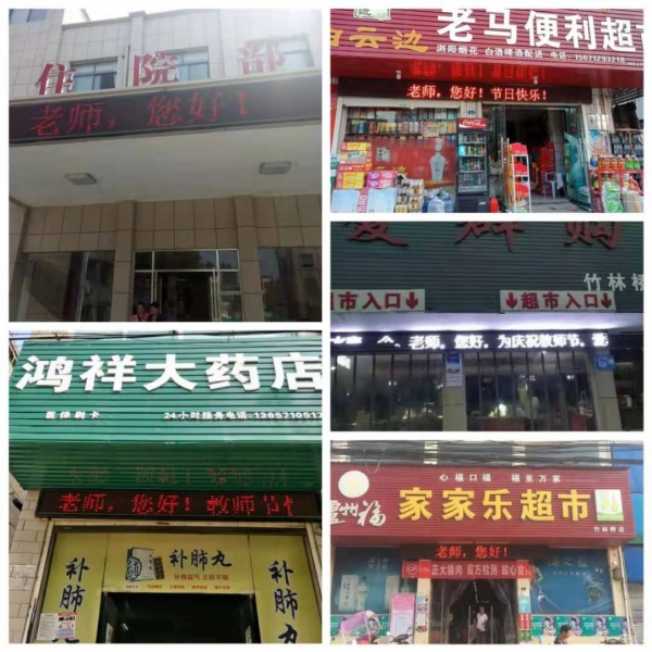这两日,我镇各单位、药店、超市等都通过LED显示屏全天滚动播出“老师,您好”字幕的形式,为教师亮灯。此活动的开展让全社会更加关心、支持教育事业,从而营造尊师重教浓厚氛围,凝聚奋进力量,让广大教师更有幸福感、成就感、荣誉感,让教师真正成为令人尊敬和羡慕的职业。
