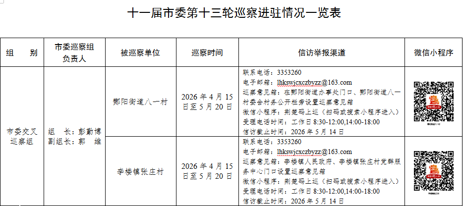 根据市委巡察工作统一部署,截至2026年4月15日,十一届市委第十三轮巡察完成进驻工作。市委交叉巡察组于2026年4月15日开始,用30天左右时间,对酂阳街道八一村、李楼镇张庄村党支部开展交叉巡察暨“回头看”。