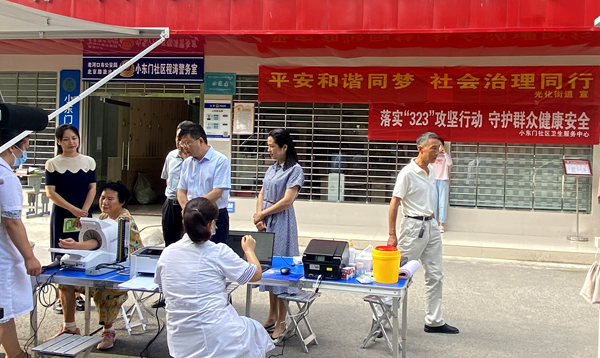 “家门口就能做体检,确实方便了我们腿脚不便的老年人。”70岁的王奶奶在医护人员的指引下,逐一进行信息登记、测量身高体重、血压、血尿常规、心电图、B超、中医体质辨识等检查。当天,小东门社区卫生服务中心组织10多位医护人员进社区,结合省“323”攻坚行动基层心脑血管疾病一体化防治工作要求,为居民开展免费筛查。