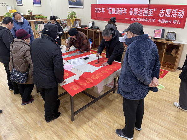 本网讯(通讯员 张俊俊)1月18日,市老年大学组织书画班学员到光化街道滨江社区开展“笔墨迎新年 春联送福至”志愿服务活动,为当地群众送上诚挚的新春祝福。