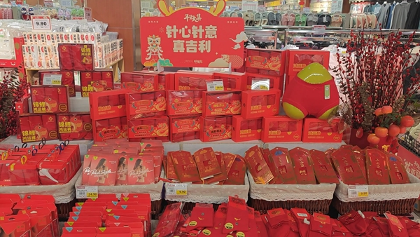 为营造浓厚的节日氛围,家家超市张灯结彩,布置一新。武商超市入口处悬挂着大红灯笼,天花板上挂满了喜庆装饰物,耳边还回荡着欢快的歌曲,让顾客一进入超市就能感受到浓浓的年味。各类年货礼盒、春联、福字等春节装饰品琳琅满目。