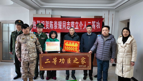 在解放军某部现役军人陈崇耀家中,市人武部和退役军人事务局联合将“二等功臣之家”的牌匾交到了陈崇耀父母手中,并现场为军属披上“一人立功、全家光荣”的绶带,宣读了立功受奖喜报。