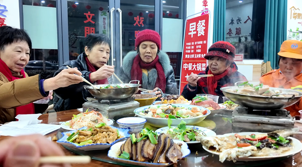 下午六点,随着涂师傅的一声吆喝“上菜喽”,团圆饭准时开始。老人们围桌而坐,一边品尝着热气腾腾的团圆饭,一边聊着家常,欢声笑语传遍整个幸福食堂。年味十足的团圆饭让老人们吃出了浓浓的“幸福味”。