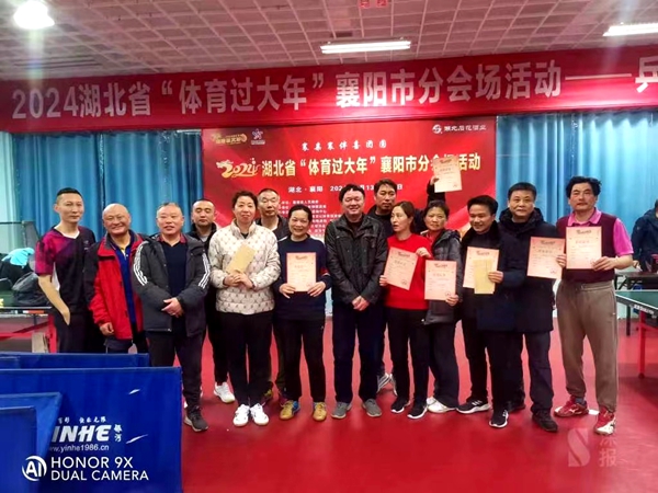 本网讯(通讯员 河乒协)近日,在湖北省体育局组织的2024年“体育过大年”襄阳市分会场活动中,由我市乒乓球运动员胡鹏、金同庆、李刚、张斌、付江波、邱晓红、潘晓凤组成的老河口乒协代表队,在乒乓球混合团体赛中荣获第二名的好成绩,实现新年参赛“开门红”。