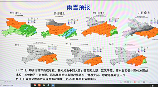 市气象台台长艾家琪说,此次天气过程特点:一是降水相态复杂,大部分地区将出现雨、冻雨、雨夹雪和纯雪,积雪深度6—12厘米,冻雨量在10—20毫米;二是持续时间长,20日白天转为冻雨或冰粒,夜间转雪,21日中到大雪,22日至24日小到中雪,并逐步减弱停止;三是降温剧烈、风力大,平均降温10—18℃,局地20℃以上,最低气温降至-5—-1℃,气温将持续偏低至26日,阵风6—8级。此次过程冷暖变幅大,叠加春节返程,致灾风险高。建议:一是积极传播气象灾害预警及预报,提醒公众做好防范;二是注意防范雨雪、道路结冰、低能见度天气对交通运输的不利影响,尤其注意防范桥梁结冰;三是注意加固蔬菜大棚、水产养殖大棚等设施,防范对农业生产的不利影响;四是防范持续低温雨雪天气可能诱发的山体滑坡等地质灾害;五是防范积雪结冰对户外建筑造成的安全隐患;六是注意防范电线结冰、铁塔覆冰对电力系统造成的不利影响;七是加强与气象部门的会商研判,密切关注天气变化,动态研判此次过程可能引发的各类不利影响。
