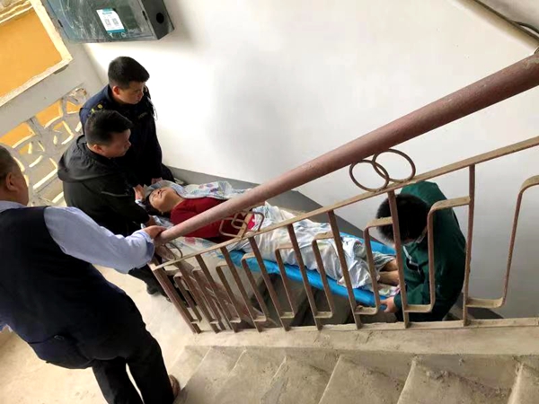 原来,李大爷和冷阿姨两人在家生活,儿女都不在身边。现在冷阿姨突患重疾,无法正常走路,急需把冷阿姨抬下楼送医院医治。邹林玲立即赶到李大爷家里,一边嘱咐李大爷带好就医证件等待120救护车,一边不断安慰李大爷和冷阿姨,有社区干部在身边帮忙,请他们放心。市一医院医务人员赶到后,邹林玲和城管队员、医护人员一起将冷阿姨从楼上抬到救护车上送去就医。