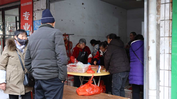 在这家店门口,前来订香肠的顾客络绎不绝,提着新鲜猪肉前来加工的市民排起了长队。大家一边耐心等待,一边交流着年货准备情况,欢声笑语中充满了对新年的期待。