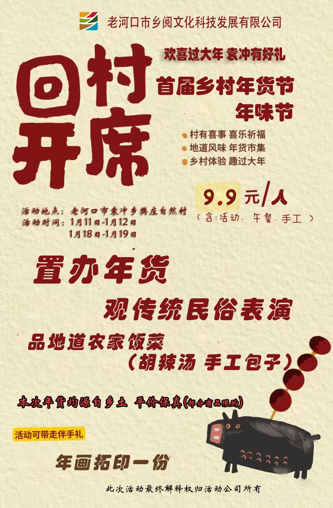 1月11日-12日、18日-19日,老河口袁冲乡樊庄村(乡阅研学基地)要搞大事啦!“欢喜过大年,袁冲有好礼”乡村年货集即将火热开场!