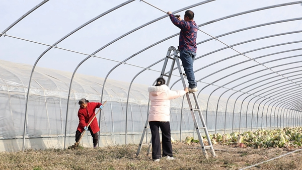 在酂阳街道王府洲晨光村,菜农陈金丽在农技专家的指导下,正和家人一起检查大棚骨架,安装立柱进行加固整修,增强棚室的抗风雪能力。她今年建了5个蔬菜大棚,以种植莴笋、油麦菜、菠菜为主。目前,这些蔬菜长势喜人,郁郁葱葱。在育苗大棚,营养盘已经填装好,她和家人也在来往搬运,加紧培育空心菜、香瓜、豇豆、黄瓜苗,为春季大田移栽做好准备。农技专家一边察看大棚加固防寒措施,一边向他们详细讲解冬季大棚蔬菜的管理技术。