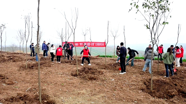 春风送暖,万物复苏。植树现场,大家分工协作,挥锹铲土、培土围堰、提水浇灌,合力种下一株株树苗。