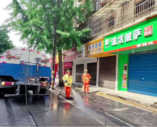 针对既有的路面污染,市城管执法局环卫处采用“高压冲刷+刷洗清洁”组合模式,使路面重现本色。并科学增设垃圾桶,增加垃圾清运频次,通过“宣传+示范”引导商户主动做好垃圾分类。