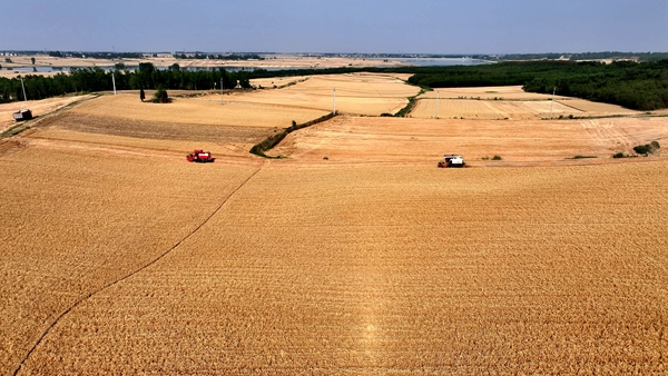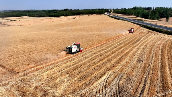 在袁冲乡郝岗村的麦田里,麦浪翻滚,机声隆隆,数台大型收割机在金灿灿的麦田间驰骋穿梭,一派繁忙的收割景象。