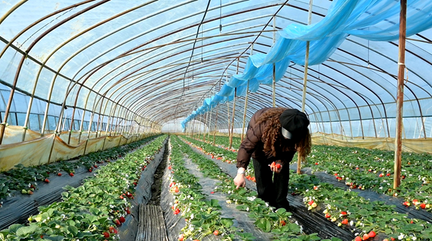 小寒时节,走进该村草莓种植基地,整齐排列的大棚里暖意融融。翠绿的藤蔓间,一颗颗鲜红饱满的草莓掩映其中,空气中弥漫着清甜的果香。工人们穿行田垄间,熟练地采摘成熟草莓,基地里一派“莓”好丰收景象。