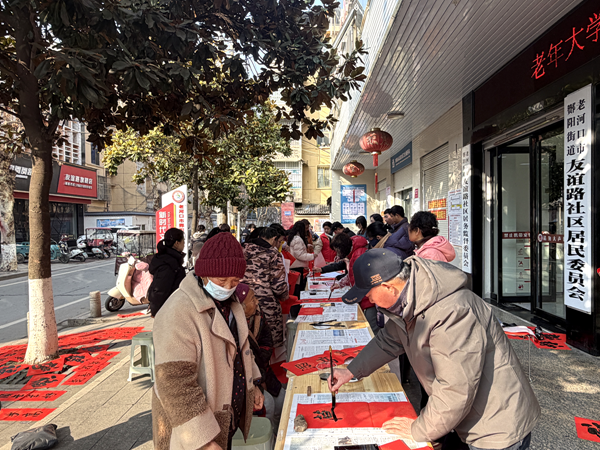 本网讯( 通讯员 张俊俊)近日,市老年大学书法班20余名书法爱好者先后走进航空路社区、友谊路社区、临江社区等7个社区开展义务送春联活动,为群众送去马年祝福。