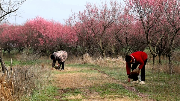 春雨过后,鲍河村的漫山梅林暗香浮动、花开正好。村民带着箩筐,漫步在梅林小道,俯身捡拾鲜嫩的地皮菜。这种形似木耳的野菜,依附在泥土与腐草之上,是春雨滋养下的天然时令食材,也是春日里独有的自然馈赠。