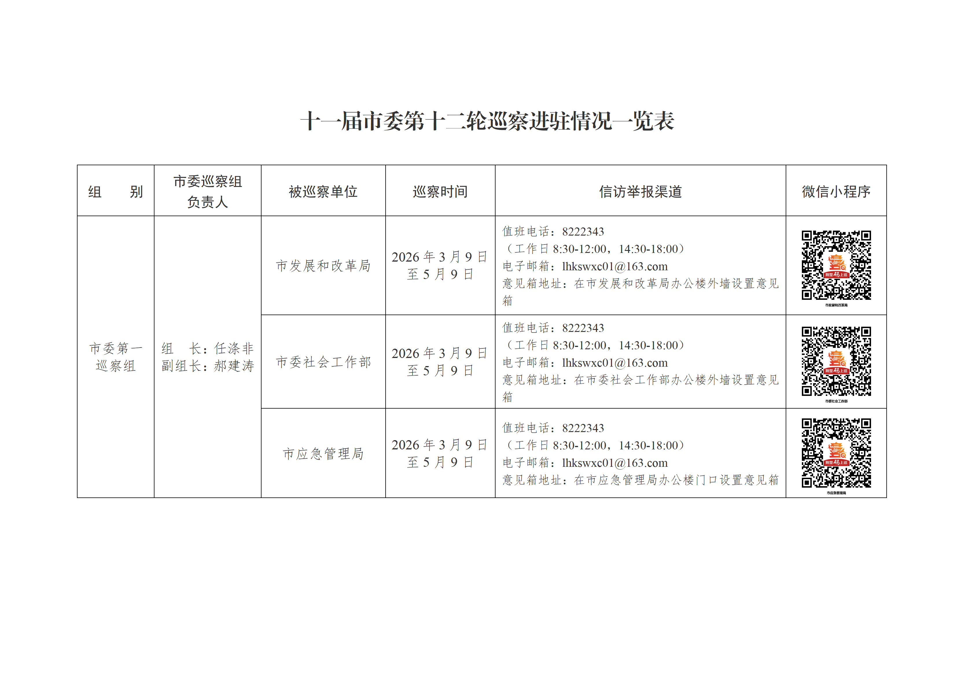 根据市委巡察工作统一部署,截至2026年3月9日,十一届市委第十二轮巡察完成进驻工作。市委巡察组将于2026年3月9日至5月9日,对市发展和改革局、市民政局、市财政局、市人力资源和社会保障局、市应急管理局、市审计局、市委社会工作部等7家市直单位党委(党组)进行常规巡察,对光化街道柳树湖村、雷祖殿村、老县城村,孟楼镇韩堂村、李河村、杨岗村6个重点村党支部进行“回头看”。市委组织部、市委宣传部分别派出专项检查组,同步开展选人用人、意识形态工作责任制专项检查。