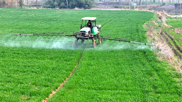 3月12日,在该镇高庄村,农垦联丰张集农业开发有限公司正有序开展冬小麦田管作业。数台高速乘坐式植保车在麦田里往来穿梭,均匀喷施药剂。相较传统人工或小型机械,此类植保车作业效率高、雾化效果好,能显著提升春季田管的时效性与作业质量。