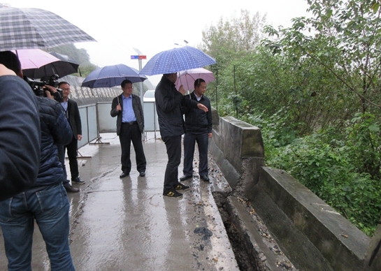 施海潮一行冒着大雨来到艾家沟察看坍塌路面修复情况,该地属S302省道七里岩段,由于近两月来长期强降雨及丹江口水库泄洪,导致路基坍塌70米,路面损毁70米。施海潮实地察看了坍塌路面,听取了相关情况汇报,要求对水毁路段进行严格封闭及交通管制,交通公路部门要继续发扬雨中作业精神,全力抢修。同时,加固路基挡土墙,在道路两端设立预警牌,及时告知过往人员、车辆注意交通安全。