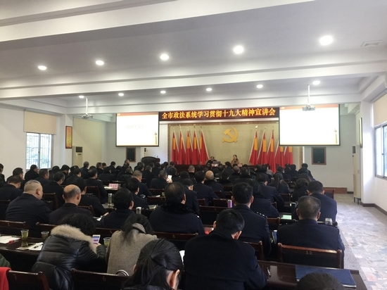 各乡镇办相关负责人,全市政法系统各单位领导班子成员,法院、检察院、公安局机关中层正职以上干部和所属二级单位主要负责人,政法委全体机关干部聆听了宣讲。