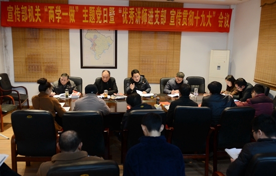 本网讯(通讯员 何轩)12月5日下午,市委宣传部机关党支部开展“两学一做”主题党日暨“优秀讲师进支部,宣传贯彻十九大”活动。宣传部部长靖德兵参加活动并发表讲话(如图)。