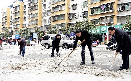 在学府路口,环卫工人和单位职工正在清扫路面的积雪,一幅热火朝天的景象。郑德安等市领导拿起铁锨,一起加入到清扫积雪的大军中。这几天,我市各部门各单位的干部职工,自觉走向街头,清除积雪。城管局也组织人力和大型机械,不间断地运送积雪,确保市区的道路尽快恢复畅通。郑德安说,解决好群众在雨雪天气的出行问题是重要的民生问题,城管部门要加大清运力度,采取有效措施,及时清除道路积雪和杂物,确保道路安全畅通和群众出行方便。