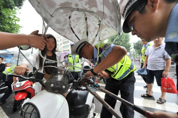 专项整治行动中,大多数被拦截的电动车主,都知道加装遮阳伞是不对的,但不知道违反了什么法律,经现场民警的解释,都能积极配合执法,并表示今后将按照法律规定,绝不再安装遮阳伞。也有少数车主对现场执法行为不能理解,埋怨民警应该去管卖车装伞的,不应该只把电动车的遮阳伞一拆了之。还有一些车主,看到执法人员在拆遮阳伞,将车骑到拆除点,主动接受拆除。主动前来拆除遮阳伞的王女士说:“有一次骑电动车转弯时,一股侧风突然将她刮倒,差点进到后面汽车的轮子下,就是因为篷子太‘喝’风了,现在想想都还后怕。篷子拆了就拆了,总不能因为图方便而丢命!”
