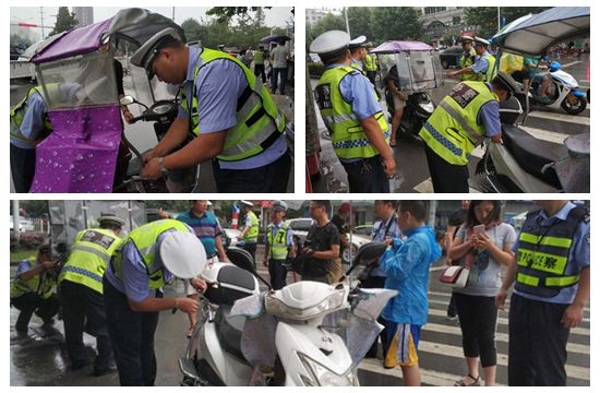 当日上午,由交警和城管执法人员联合组成的专项整治行动专班人员,在北京路与胜利路交叉口,对道路上行驶的非法加装遮阳伞、雨篷(以下简称遮阳伞)的电动车进行拦截,并全部推行到抗战广场警务平台旁进行拆除,对消除违法行为的电动车予以放行,对车主暂未处罚。仅4日上午就拆除电动车遮阳伞150余个。
