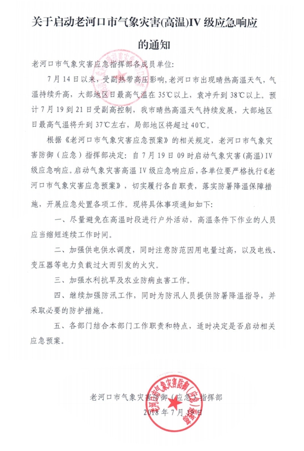 本网讯 7月19日,我市气象灾害防御(应急)指挥部发布通知,启动气象灾害(高温)IV级应急响应(见下图)。