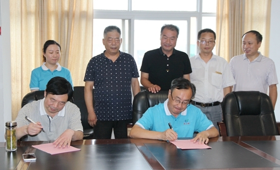 市教育局局长李勇(前排左)和光化特酒业董事长、总经理胡育明(前排右)签订协议