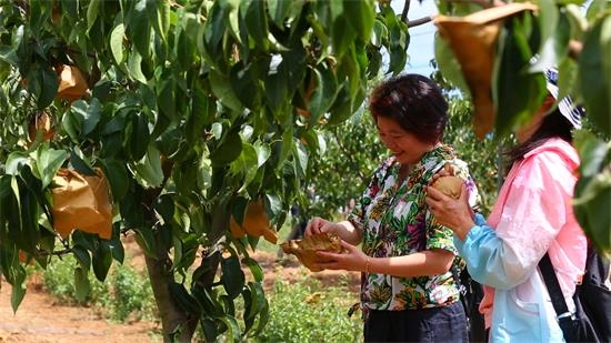 树枝上累累硕果,新鲜饱满,让人味蕾顿开。游客们在果园内设置的免费梨桃品尝点尝过水果的甜美多汁后,纷纷提起果篮,拎起布袋,涌入水果采摘的大潮。