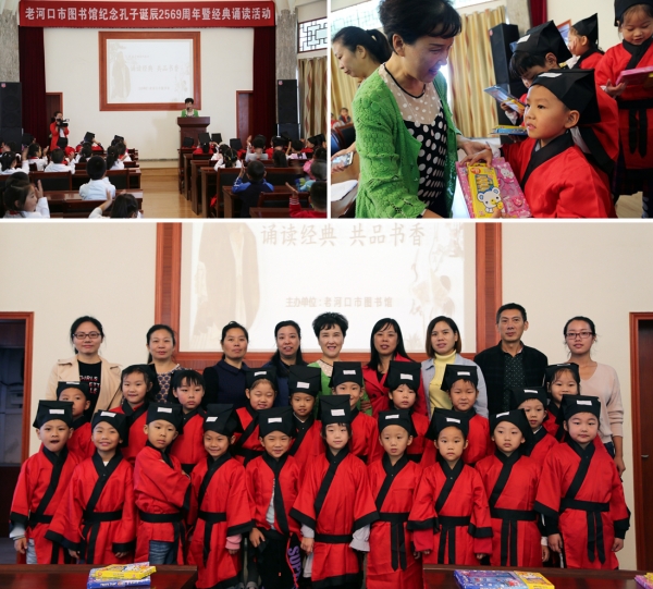 市图书馆向小学生们赠送了精美的文具和图书。活动中,来自市内小学的100多名学生们身着汉服、峨冠博带,集体朗读《弟子规》和《论语》名句,二十几名小学生表演背诵国学经典,通过识孔子、诵经典、观国学动画等一系列活动,增强了少儿们对传统文化的认知和热爱。