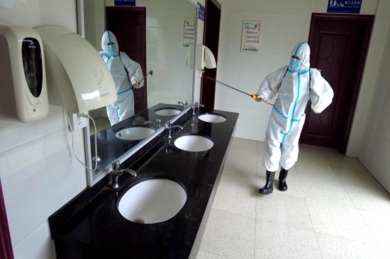 在水西门公厕,公厕保洁人员在完成每天的常规清洁后,又对公厕内部进行了全面消毒。