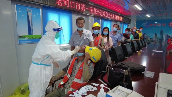 市一医院外迁项目是我市工程体量最大的在建项目之一,共有700多名施工人员在此务工。8月20日,记者在该项目指挥部看到,这里已经设置临时核酸检测取样点,现场共有4个检测通道,配备4组医护人员进行咽拭子采样操作,工友们也均佩戴口罩、手持编号,10人一组有序排队检测。