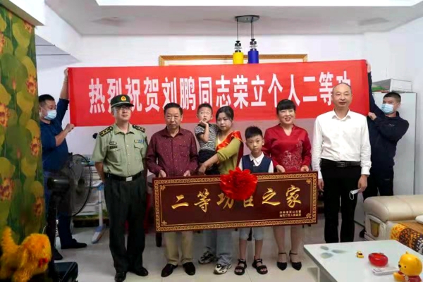 本网讯(通讯员 朱正文)9月1日,市人武部和市退役军人事务局相关负责人一同将二等功喜报、牌匾和奖金送到刘鹏家中,祝贺他在部队荣立二等功。