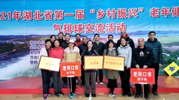 本网讯(通讯员 华丽 绪军 陈克)近日,2021年湖北省第一届“乡村振兴”老年气排球交流活动在丹江口市举行。我市男子代表队获男子组“优胜奖”,女子代表队获女子组“优秀奖”,老河口市代表队获“道德风尚奖”,樊东兵、刘文莎分获男女组优秀队员奖。