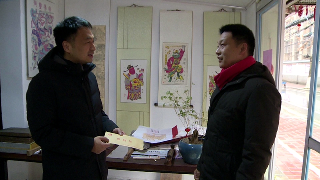 在市群众艺术馆高级工艺美术师陈洪斌工作室,胡华鹏观摩他最新创作出的具有虎年元素的木版年画《祥瑞福虎》,希望他传承、延续好这项国家级非物质文化遗产,为群众创作出更多具有欢乐、祥和、年味的优秀作品。