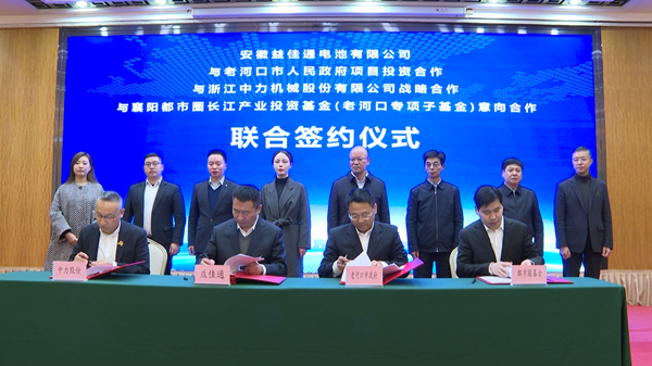 在襄阳市副市长张学林、襄阳市政府副秘书长吴恒、我市市委书记曹祖金等领导见证下,安徽益佳通电池有限公司总裁周德清与我市市长冯玉强、浙江中力机械股份有限公司董事长何金辉、湖北高投汇盟创业投资管理有限公司董事长夏进强共同签订《4GWh工业动力锂电池电芯及PACK?生产线项目投资合作协议》《中力股份与安徽益佳通战略合作协议》《益佳通B轮襄阳都市圈长江产业投资基金(老河口专项子基金)投资意向协议》。