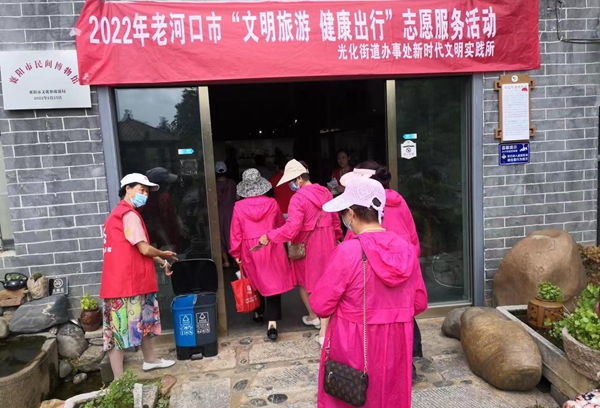本网讯(通讯员 尹燕宏)6月23日,光化街道新时代文明实践所在西关汉江奇石文创园开展“文明旅游健康出行”志愿服务活动