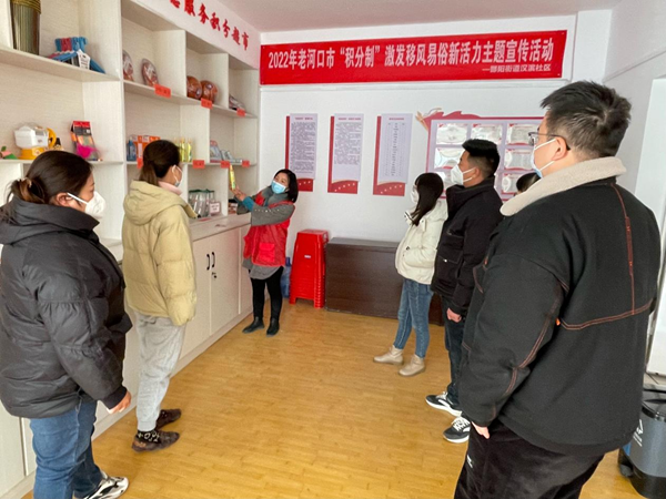汉滨社区将破除陈规陋习,抵制高价彩礼,倡导婚事新办、丧事简办等移风易俗内容纳入积分设置,由志愿者向辖区居民志愿者介绍积分兑换制度、积分兑换标准及积分兑换实施细则等内容。